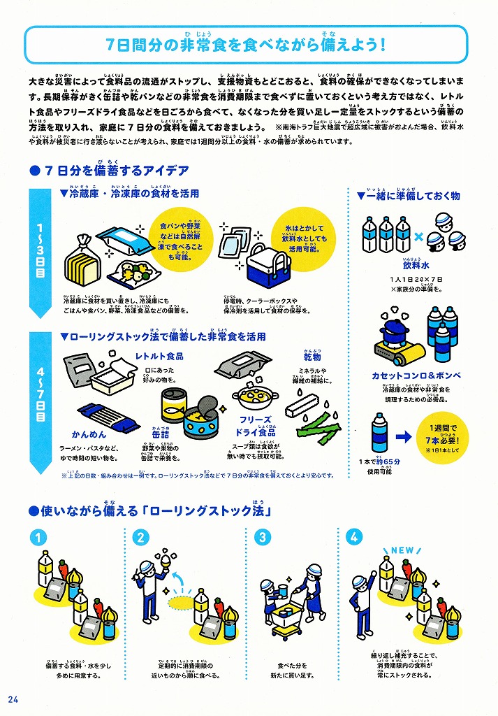 昭和の頃は最低3日と云われていましたが、1週間分は用意しておいた方がよいです。