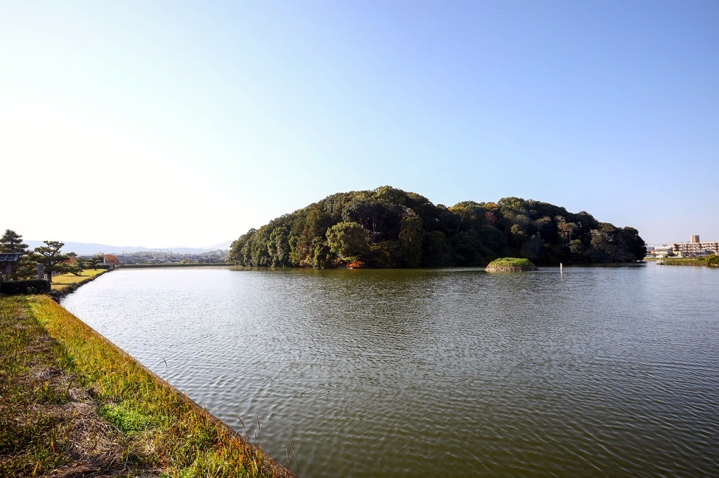 5世紀初期に造られたとされる全長約227mの巨大な前方後円墳。被葬者は、『古事記』や『日本書紀』にも記される第11代垂仁天皇の「菅原伏見東陵(すがはらふしみのひがしのみささぎ)」に比定されている。また古墳の東側には小さな島が築かれており、これは天皇の死を嘆き死んだ田道間守(たじまのもり)の墓と伝えられているが、この小島のある辺りは濠を貯水のために拡張したことから島状になったと考えられている。古墳の周囲をめぐる濠はつねに水が満ちて美しい。陵墓のため参拝のみ可。