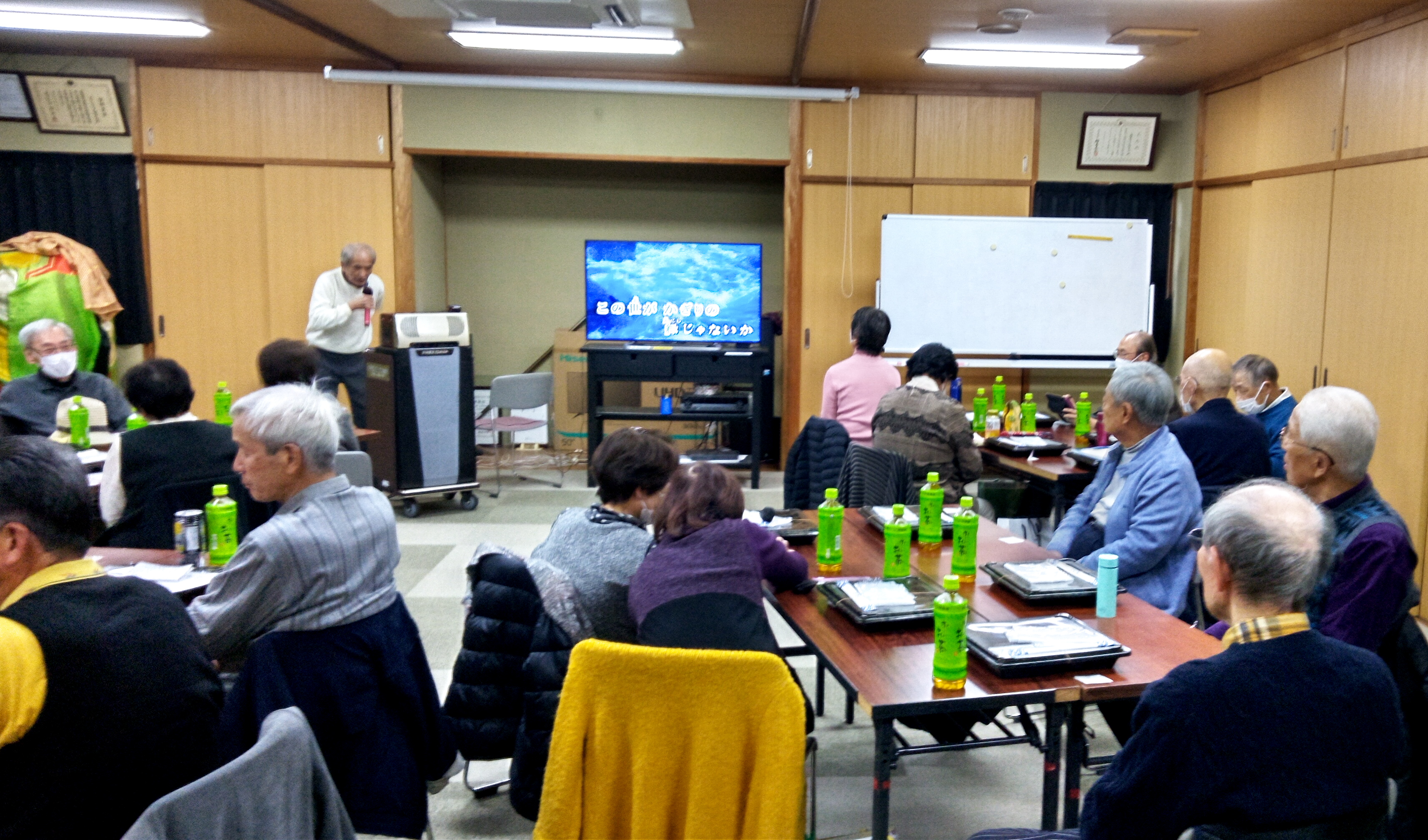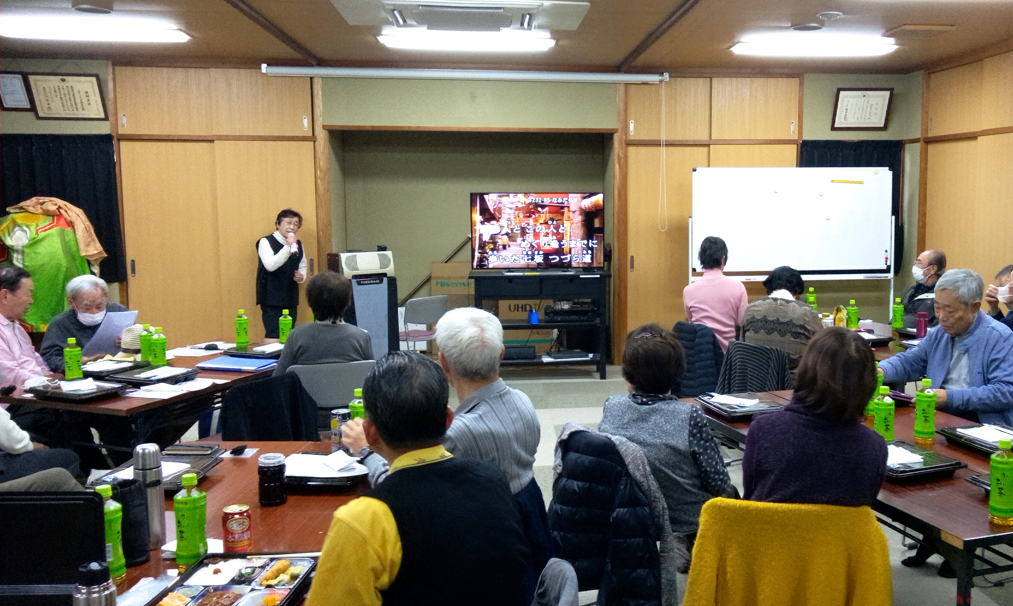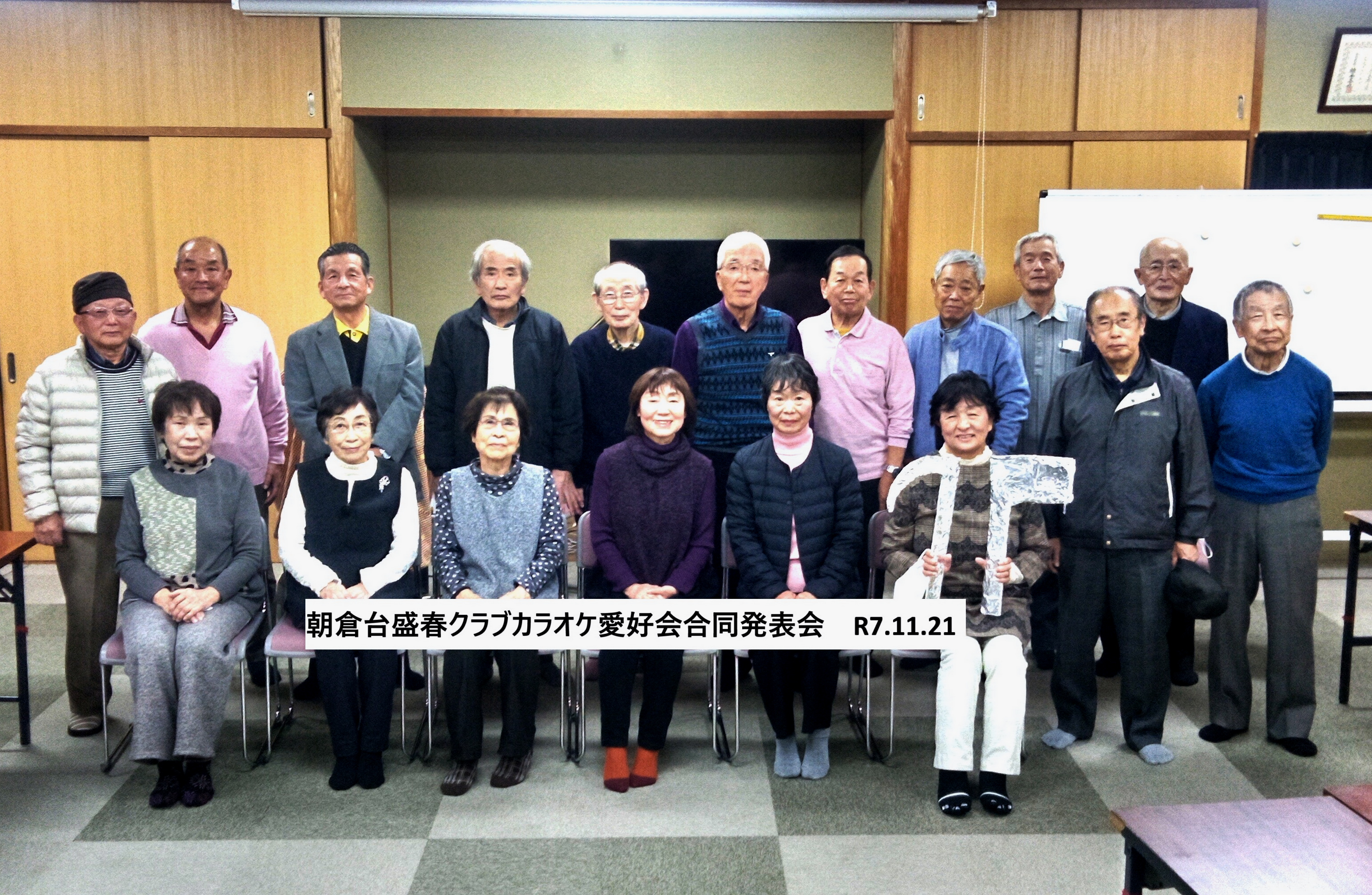 11月21日(金) 朝倉台盛春クラブカラオケ愛好会合同発表会 カラオケ愛好会は、11月21日(金)午後集会所2階で合同発表会を開催しました。 同愛好会は毎月第3金曜日、昼組(会員11名)・夜組(15名)の二部に分かれてカラオケを楽しんでいます。 今回、下半期のまとめとして各会員が得意の持ち歌をそれぞれ2曲披露しました。 農夫,農婦に扮した2人が「麦畑」を熱唱、発表会を大いに盛り上げるなど楽しいひと時を過ごすことが出来ました。参加者20名 トップページに戻る